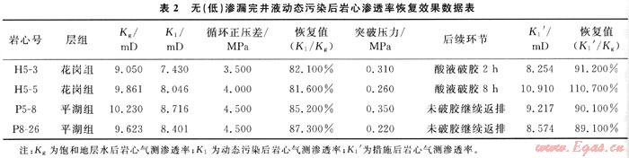 滲透率恢復(fù)值為120~130,但有沉淀、分層和絮凝,說明與地層水的配伍性良好。但是為考察無(低)滲漏完井液體系在高溫作用下的保護(hù)儲(chǔ)層效果即巖心滲透率恢復(fù)值情況,選取目標(biāo)層4塊巖心進(jìn)行完井液動(dòng)態(tài)污染實(shí)驗(yàn),實(shí)驗(yàn)溫度為120~130℃,動(dòng)態(tài)循環(huán)正壓差為3.5~4.5MPa,實(shí)驗(yàn)數(shù)據(jù)見表2。