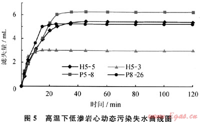濾失性無(低)滲漏完井液體系在動(dòng)態(tài)污染試驗(yàn)的前20min,5塊巖心動(dòng)態(tài)失水速率普遍較大,這可能是因?yàn)檐涱w粒狀完井液受擠壓時(shí)發(fā)生的物理脫水現(xiàn)象,但總量均沒有超過7mL。20min左右,致密的碳化膠質(zhì)暫堵層逐漸形成,加上軟顆粒本身的物理暫堵功能,雙重暫堵下巖心基本不再發(fā)生濾失(圖5),說明無(低)滲漏完井液高溫下與巖心接觸時(shí)發(fā)生的化學(xué)質(zhì)變有利于控制完井液的失水滲漏。從濾失量減少為0的時(shí)間可看出,膠質(zhì)暫堵層在120~130℃下形成的時(shí)間在20min左右,最低的約6min,如H5-3號(hào)巖心,6min左右濾失量就降至為0,這可能與巖心中的黏土礦物類型和總含量有關(guān)。