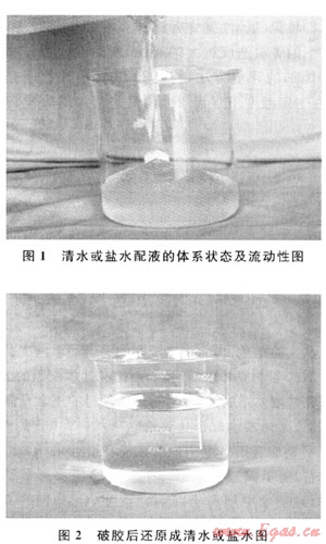 無(低)滲漏完井液主要由有機(jī)高分子吸水材料膠凝劑、絡(luò)合淡水中二價(jià)陽離子的螯合劑、調(diào)節(jié)流變性的穩(wěn)定劑組成?;九浞綖椋旱?0.5%螯合劑YF-1+1%~2%膠凝劑SW-1+0.5%穩(wěn)定劑WDJ-1。完井液由毫米級(jí)的軟顆粒組成,顆粒尺寸分布在0.5~3mm,軟顆粒易變形,有一定強(qiáng)度,該完井液體系用酸液能完全破膠,并能還原成清水(圖1、2)。
