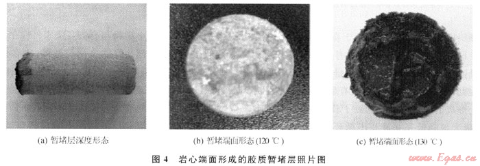 從表2中實(shí)驗(yàn)數(shù)據(jù)可知:低滲巖心自然反排的突破壓力較低,均小于0.4MPa,滲透率恢復(fù)值均超過80%,如果反排時(shí)間繼續(xù)延長(zhǎng),巖心滲透率恢復(fù)值還可繼續(xù)得以恢復(fù),無(低)滲漏完井液所形成的暫堵層完全可以自然解堵,在完井和修井結(jié)束后,無論采用連續(xù)油管或氣舉都很容易誘噴解堵。用酸液破膠后,巖心的滲透率恢復(fù)值會(huì)繼續(xù)增加,甚至可超過100%,但對(duì)于低滲透氣藏,為減少液相部分滯留而造成水相圈閉損害,不推薦采用酸液破膠。另外,實(shí)驗(yàn)中有了新發(fā)現(xiàn):巖心端面在高溫下形成了一種黃至黑色膠質(zhì)致密暫堵層,有一定強(qiáng)度,不能用手輕易刮開,深度約3mm(圖4-a),且隨著實(shí)驗(yàn)溫度增加暫堵層顏色加深(圖4-b、c),認(rèn)為是有機(jī)高分子完井液在接觸巖心時(shí)發(fā)生碳化(熱催化)反應(yīng)所得,這與新型完井液體系的構(gòu)建思路基本一致。