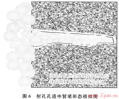 根據(jù)化學(xué)反應(yīng)定律中溫度時(shí)間互為補(bǔ)償理論[11],在射孔期間巖石瞬間的高溫便可加速擠入炮眼中的有機(jī)高吸水材料的碳化(熱催化)反應(yīng),碳化暫堵層的形成時(shí)間將大為縮短,可有效降低完井液的漏失。雙重暫堵模型見圖6。