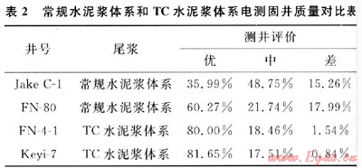 TC柔性水泥漿體系在蘇丹6區(qū)7口井的Φ244.5mm中間套管固井中得到了成功應(yīng)用,聲波測(cè)井結(jié)果為:優(yōu)質(zhì)率平均提高30%以上,不合格率平均下降了15%。表2是蘇丹6區(qū)采用常規(guī)水泥漿體系和TC水泥漿體系封固Φ244.5mm套管的固井質(zhì)量對(duì)比結(jié)果,分別取自各井完井前CBL電測(cè)評(píng)價(jià)資料,數(shù)據(jù)顯示應(yīng)用TC柔性水泥漿體系后固井質(zhì)量顯著提升。