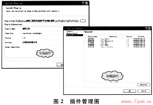 插件平臺是整個系統(tǒng)的核心,是功能插件實現(xiàn)的基礎。插件平臺包含重要的核心組件,分別有運行時核心、工作臺GUI、項目管理、幫助系統(tǒng)數(shù)據(jù)管理和平臺數(shù)據(jù)業(yè)務等。插件平臺不包含具體的功能實現(xiàn),只為功能插件提供運行環(huán)境、實現(xiàn)接口及數(shù)據(jù)管理,而插件實現(xiàn)其業(yè)務功能要依賴平臺接口。插件通過平臺安裝的方式安裝入平臺中,同時平臺也提供插件管理功能,如卸載插件等(圖2)。可以很好地解決軟件開發(fā)與集成問題,適用高級版和低級版的軟件安裝,這對程序組織開發(fā)十分方便。軟件系統(tǒng)采用C++語言的跨平臺GUI工具包QT開發(fā)[2~3],可運行于Windows、Linux、Unix等多個平臺之上。