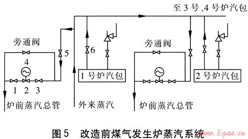 這樣,在正常運行時,8號閥全開,將自產(chǎn)蒸汽全部用于煤氣生產(chǎn),4號閥全關(guān)。不足部分通過主路上的2號閥來調(diào)節(jié)外來蒸汽進行補充。在生產(chǎn)負荷較小時,將8號閥關(guān)閉,4號閥全部打開,5號閥關(guān)閉,靠2號閥來調(diào)節(jié)白產(chǎn)蒸汽供入煤氣發(fā)生爐內(nèi)的蒸汽量。