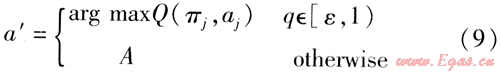 設(shè)當(dāng)前狀態(tài)πj={a1,a2,a3,…,aj}下螞蟻k位于節(jié)點j,螞蟻將按照ε-貪婪規(guī)則確定在節(jié)點j′要選擇的行為a′,即以概率1-ε按貪婪策略選取當(dāng)前狀態(tài)下最大Q值對應(yīng)的行為。而以概率ε隨機(jī)選擇一個當(dāng)前狀態(tài)下允許行為的表達(dá)式為: