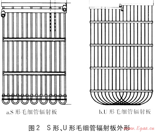 S形、U形毛細管輻射板外形見圖2。S形毛細管輻射板比較常用,它是由供回水主管和若干毛細管組成的。毛細管外徑為4.3mm,標準間距為20mm,還可以根據(jù)要求進行調(diào)整。管材可采用無規(guī)共聚聚丙烯管(PP-R管)、耐熱聚乙烯管(PE-RT管)、聚丁烯管(PB管)。安裝方式有隱蔽式、半隱蔽式:隱蔽式是將毛細管輻射板安裝在圍護結(jié)構(gòu)內(nèi)部;半隱蔽式是將毛細管輻射板安裝在圍護結(jié)構(gòu)表面,采用裝飾物遮擋。