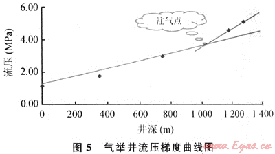 1) 第一種方法是根據油井產量和在油管內測流壓梯度來分析氣舉井的注氣點位置,分析氣舉井是否存在多點注氣問題,是否按照設計的注氣深度在正常工作[5~6],其氣舉井的流壓梯度曲線見圖5。