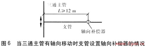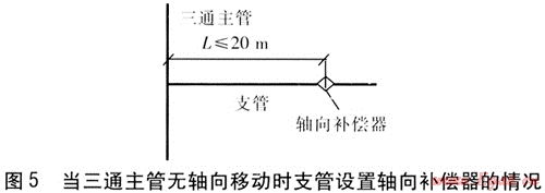 當在支管上無法實現(xiàn)自然補償時,可以考慮在支管上設置軸向補償器,軸向補償器的類型可根據(jù)供回水溫度、支管的管徑及其他技術要求選用。當三通主管無軸向移動時,支管設置軸向補償器的情況見圖5。為了降低支管的軸向移動對三通的推力,軸向補償器距三通的距離L應滿足L≤20m[7]。