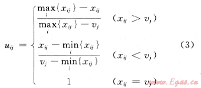 一般情況下,指標(biāo)按性質(zhì)可分為正指標(biāo)、逆指標(biāo)和中性指標(biāo)。此外,由于不同指標(biāo)之間的量綱不一樣,因而也必須對(duì)指標(biāo)數(shù)據(jù)進(jìn)行無(wú)量綱化處理。根據(jù)指標(biāo)性質(zhì)分別為3種類(lèi)型指標(biāo)設(shè)計(jì)了相應(yīng)的指標(biāo)處理函數(shù)。