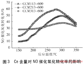 針對NO催化氧化的重要性,國內(nèi)外學(xué)者開展了積極的研究,其中以貴金屬Pt、Pd催化劑的轉(zhuǎn)化效率較高,300℃時轉(zhuǎn)化率接近90%[7~9]。我國貴金屬資源相對匱乏且造價高昂,主要用于汽車尾氣處理,而大型煙氣處理裝置則難以實現(xiàn)。近年來,以過渡金屬為活性主體的新型催化劑引起了國內(nèi)外學(xué)者的重視,并進行了大量研究[10~12]。我國的稀土儲量位居世界第一,將各類稀土元素應(yīng)用于催化領(lǐng)域已有大量報道,其中以La、Ce應(yīng)用較多。以CeO2為例,由于其強大的儲存和釋放氧的能力,已被應(yīng)用到多個催化方向(如CO催化氧化)[13]。