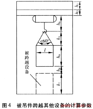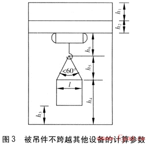 對于被吊件跨越其他設(shè)備的情況,起升高度需滿足被吊件底部距其所跨越設(shè)備頂部的距離不小于500mm,計算參數(shù)見圖4。