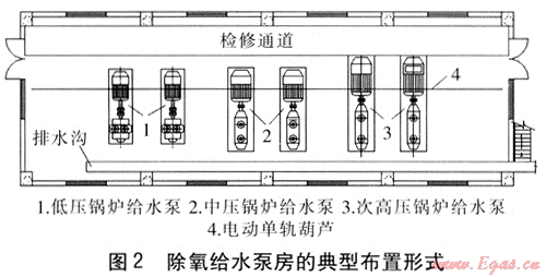 除氧給水泵房內(nèi)水泵之間的凈距不小于800mm,對于大型泵應(yīng)適當(dāng)加大凈距。通常泵房內(nèi)鍋爐給水泵規(guī)格較多,有低壓鍋爐給水泵、中壓鍋爐給水泵、次高壓及高壓鍋爐給水泵,泵的結(jié)構(gòu)尺寸往往差別較大。因此,操作檢修通道應(yīng)保證結(jié)構(gòu)尺寸最大的泵(通常為次高壓或高壓鍋爐給水泵)的要求,一般通道寬度不小于1250mm。