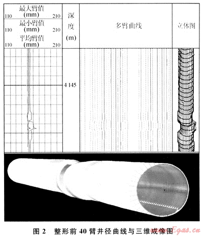 該井位于川東斷褶帶普光構(gòu)造,2007年6月采用Ф177.8mm氣密封套管完井,人工井底為5467m,套管鋼級(jí)為T(mén)N110S,壁厚為12.65mm,抗擠毀強(qiáng)度為90.0MPa,其中抗H2S和CO2腐蝕的高鎳基合金套管[3]井段為5018.03~5479.84m。2008年5月作業(yè)投產(chǎn)時(shí)Ф146mm×2.5m通井規(guī)在4147.76m遇阻,分析為套管變形。2008年7月29日使用CJ40多臂井徑測(cè)井儀進(jìn)行檢測(cè),發(fā)現(xiàn)在嘉陵江組4~5的鹽巖層段存在2段套管變形。其中4147.0~4151.0m套管變形最小內(nèi)徑為138.8mm,生產(chǎn)管柱和封隔器無(wú)法按工程設(shè)計(jì)下至合金套管位置。井徑測(cè)井曲線及套管變形三維成像見(jiàn)圖2。為了保證修整后的套管抗擠毀強(qiáng)度[3~5]以及修整后井筒的密封性能,經(jīng)過(guò)多次技術(shù)論證,采用滾壓整形技術(shù)擴(kuò)展變形套管通徑。