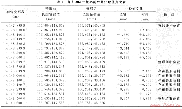為了檢驗(yàn)整形效果和了解整形后套管回彈情況,整形24h后用40臂井徑測(cè)井儀器復(fù)測(cè),整形段套管內(nèi)徑變化對(duì)比見(jiàn)表1。從表1中可以看出,套管變形嚴(yán)重井段4148.0~4148.6m的長(zhǎng)軸徑值縮短1.3~3.6mm;短軸徑值增加2~9.7mm,具有較明顯的整形效果;井段4148.9~4149.3m整形效果不理想,該處為套管接箍,分析存在套管整形毛刺。