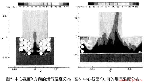 兩個垂直的中心截面沿X方向和Y方向的煙氣溫度分布如圖5和圖6。從圖中可以看出,由于煙氣流過下部換熱管的流速較小,所以換熱量較大,管后的溫度也較低。煙氣通過左右對稱的四排管子傳遞熱量,完成傳熱過程。排煙管出口的煙氣溫度比較均勻。計(jì)算得到排煙平均溫度為76.4℃,出水溫度為21.33℃,換熱管的傳熱計(jì)算總面積為0.088m2,總傳熱量為1213W,綜合傳熱系數(shù)較高:K=137W/m2.℃。