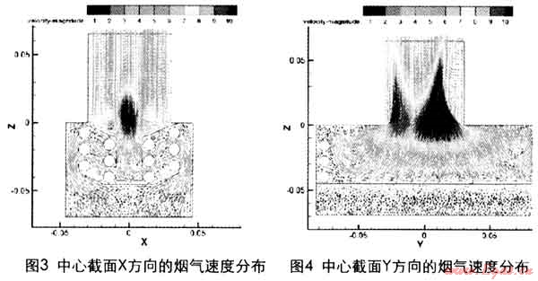 兩個垂直的中心截面沿X方向和Y方向的煙氣速度分布如圖3和圖4。從圖中可以看出流過換熱管的煙氣速度總體還比較均勻,下部換熱管由于阻力較大因而速度稍小。在排煙管的中心區(qū)域,由于截面收小,所以氣流速度較大。但到出口處基本上混合均勻。計(jì)算得到煙氣進(jìn)口的平均速度為1.11m/s,煙氣出口的平均速度為5.37m/s。