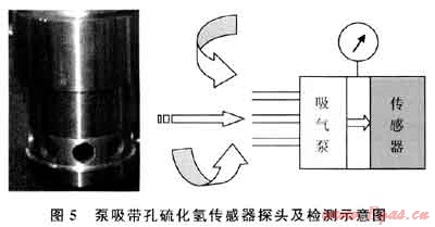 研究認為,最好選擇膜片四周都有透氣膜或透氣孔的傳感器,這樣即使在無風的情況下周邊的硫化氫也容易進入測量探頭,有風的時候效果更好。這種多向測量的改進,很好地保證了測量的及時性,傳感器內(nèi)部再加上泵吸,效果則更為理想。圖5所示的是目前國內(nèi)廠家生產(chǎn)的一款四周帶孔的泵吸式硫化氫檢測傳感器。