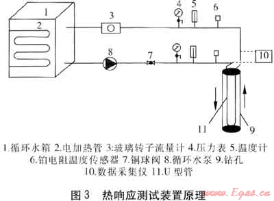 熱響應測試原理是對地埋管中的循環(huán)水進行持續(xù)的恒熱流加熱,根據(jù)U型管進出口水溫隨時間的變化規(guī)律計算出巖土的熱物性參數(shù)。