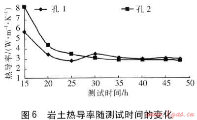 ③ 在實際測試中,采用線熱源模型進行熱響應測試,測試至少要進行45h才能計算得到穩(wěn)定合理的巖土熱導率。