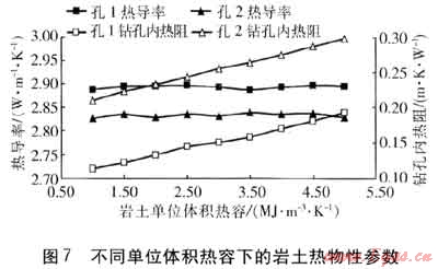④ 基于線熱源模型和雙參數(shù)估計法,巖土的單位體積熱容對熱導率幾乎沒有影響,對鉆孔內(nèi)熱阻有一定影響。