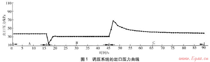 緩沖管道容積的設(shè)置通常有兩種方法:一種是過(guò)盈計(jì)算方法,需結(jié)合供氣電磁閥的開(kāi)啟時(shí)間、噴火設(shè)備的用氣量、噴火設(shè)備的熄火壓力、調(diào)壓系統(tǒng)的響應(yīng)時(shí)間和調(diào)壓器的流量系數(shù)等綜合計(jì)算,并考慮一定的管道容積余量。另一種是實(shí)驗(yàn)驗(yàn)證方法,即在實(shí)驗(yàn)室模擬實(shí)際情況來(lái)驗(yàn)證管道容積是否能滿足使用要求。例如:在香港海洋公園大型噴火項(xiàng)目中,已知噴火設(shè)備的最大用氣量為6000m3/h,受場(chǎng)地限制,噴火設(shè)備下游為長(zhǎng)30m、公稱直徑為250mm的緩沖管道。為驗(yàn)證此管道容積是否能滿足使用要求,特進(jìn)行實(shí)驗(yàn)驗(yàn)證。通過(guò)在上海飛奧燃?xì)庠O(shè)備有限公司閥門(mén)與調(diào)壓實(shí)驗(yàn)室進(jìn)行的模擬試驗(yàn),得到了調(diào)壓系統(tǒng)的出口壓力曲線,見(jiàn)圖1中的A、B段。