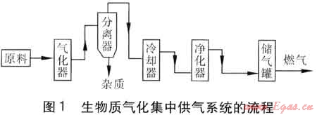 目前,生物質(zhì)資源的處理方式主要有生物質(zhì)氣化技術(shù)[12~14]、固化成型技術(shù)[15~18]。國內(nèi)提出的生物質(zhì)氣化集中供氣系統(tǒng)的流程見圖1。該技術(shù)采用氣化的方法將農(nóng)林生物質(zhì)轉(zhuǎn)換為可燃?xì)怏w,氣化效率達(dá)到了72%~75%,燃?xì)獾蜔嶂颠_(dá)到5MJ/m3。生物質(zhì)固化成型技術(shù)是將農(nóng)林生物質(zhì)粉碎后,通過成型設(shè)備加工成顆粒、塊、棒、片等形狀直接燃燒。固化成型技術(shù)的工藝、設(shè)備簡單,燃料便于儲存和長途運(yùn)輸,易于實(shí)現(xiàn)產(chǎn)業(yè)化大規(guī)模生產(chǎn)和應(yīng)用。這種技術(shù)不需特殊的燃燒設(shè)備,對現(xiàn)有鍋爐設(shè)備進(jìn)行簡單改造即可,技術(shù)經(jīng)濟(jì)性能相對較高。