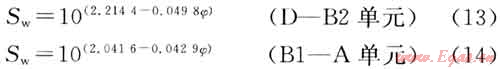 3) 利用測井計算的孔隙度,根據(jù)低侵巖心分析的含水飽和度和孔隙度對數(shù)回歸公式計算,其公式為: