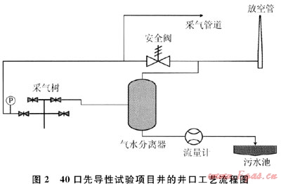 40口先導(dǎo)性試驗項目井的井口流程中,煤層氣從井口套管中產(chǎn)出,然后進入采氣管道,往閥組匯集。采氣管道前裝有安全閥,采氣管道壓力達(dá)到0.4MPa后,安全閥跳起,超壓氣體進入放空管放空,避免系統(tǒng)超壓而產(chǎn)生危險。產(chǎn)出水從油管中產(chǎn)出,首先經(jīng)過氣水分離器進行分離,分離出來的氣體由放空管進行放空,分離后產(chǎn)出水進行流量計量,然后排放到井口污水池。該井口工藝流程如圖2所示。