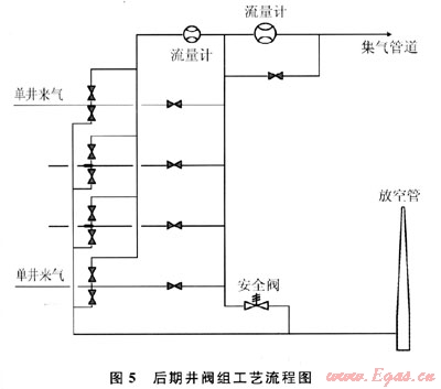 后期施工井的閥組取消了調(diào)壓閥,井口來的煤層氣到達(dá)集氣閥組后,進入集氣閥組的生產(chǎn)匯管,經(jīng)總計量后直接進入管道,整個集氣系統(tǒng)從井口到增壓站為1個封閉系統(tǒng),集輸壓力通過系統(tǒng)自動調(diào)整平衡。單井煤層氣計量時,首先進入計量匯管,經(jīng)流量計計量后,再進入生產(chǎn)匯管。每口井的采氣管道在集氣閥組都有放空流程,當(dāng)采氣管道檢修時,打開放空閥,進入放空匯管,經(jīng)放空管放空。生產(chǎn)閥組匯管上設(shè)有安全閥,當(dāng)采、集氣管道壓力達(dá)到0.4MPa時安全閥起跳,將超壓部分氣體排放至放空管。該閥組工藝流程如圖5所示。
