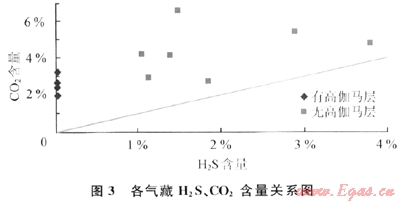 硫酸鹽熱化學(xué)還原反應(yīng)的一個(gè)重要特征就是隨天然氣中H2S含量增高,CO2的含量也相應(yīng)增高,且C02的含量高于H2S含量[7~8]。這一反應(yīng)要產(chǎn)生H2S或HS-,這些產(chǎn)物溶于水變成為氫硫酸,氫硫酸在碳酸鹽巖儲層中與巖石孔壁反應(yīng)產(chǎn)生溶蝕作用,造成儲層溶蝕孔洞發(fā)育,釋放的C02造成天然氣中C02含量高于H2S含量。該區(qū)各氣藏正好具有C02含量高于H2S含量的特征(圖3)。另外,在高H2S含量的Sam-53-1井巖心觀察和薄片分析表明,儲層內(nèi)溶蝕孔洞發(fā)育,而H2S含量低的構(gòu)造內(nèi),溶蝕孔洞不發(fā)育,這些均說明該區(qū)H2S的確為硫酸鹽熱化學(xué)還原反應(yīng)產(chǎn)生。