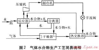 利用水合物形式進(jìn)行氣體儲存的研究主要涉及到以下兩種技術(shù),一是利用水合物儲運(yùn)天然氣或煤層氣的技術(shù)[21~23],二是水合物儲氫技術(shù)。水合物儲運(yùn)天然氣技術(shù)已在日本進(jìn)入應(yīng)用實(shí)施階段[24]。圖2為氣體水合物生產(chǎn)工藝簡易流程。氣體經(jīng)干燥器干燥凈化后與水在反應(yīng)器中生成水合物、水的混合物。從反應(yīng)器出來的混合物進(jìn)入分離器,在分離器中進(jìn)行初步分離。分離出的少量純水由分離器下部引出,由于這部分水有一種保持晶體結(jié)構(gòu)的趨勢,故重新循環(huán)進(jìn)入反應(yīng)器;分離后得到的水合物經(jīng)干燥器干燥,并經(jīng)熱交換器進(jìn)一步降溫后得到成品水合物。氣體則從反應(yīng)器排出后先進(jìn)行壓縮,提高氣體壓力,再經(jīng)制冷機(jī)和節(jié)流閥進(jìn)行降溫處理,再回收重新利用。目前水合物儲氫技術(shù)尚處于探索階段。