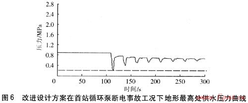 由圖6可知,在首站循環(huán)泵斷電事故工況下,地形最高處的供水壓力高于飽和蒸汽壓力,供熱介質(zhì)不會發(fā)生汽化。動態(tài)水力分析表明,以較高的供水溫度減小供熱介質(zhì)流量,以及提高壓力水平,可以在系統(tǒng)出現(xiàn)事故工況時,保證供熱系統(tǒng)安全運行。
