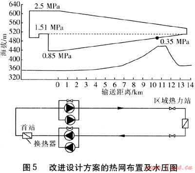 按靜態(tài)水力分析,初步設計方案是合理的,最大壓力在首站處(壓力為1.66MPa),外部管網(wǎng)靜態(tài)運行壓力小于1.6MPa。動態(tài)水力分析顯示,初步設計方案的設計、運行易由于壓力的大幅度波動產(chǎn)生超壓或汽化,導致嚴重的安全問題。為提高輸送干線的安全性,需對初步設計方案進行改進:提高設計壓力,取消中繼泵站,系統(tǒng)最大壓力為2.5MPa;在首站處供水溫度提高為135℃,回水溫度不變,供回水溫差加大5℃,流量減小8%;首站循環(huán)泵采用兩級泵形式,保證控制的穩(wěn)定性。改進設計方案的熱網(wǎng)布置及水壓圖見圖5。