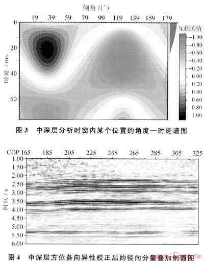 校正了淺層方位各向異性后,在此數(shù)據(jù)基礎(chǔ)上,設(shè)置中深層分析時(shí)窗為3.5~3.7s。圖3為中深層分析時(shí)窗內(nèi)與圖1相同CDP位置的角度一時(shí)延譜。對(duì)比圖3和圖1可知,中深層快慢橫波時(shí)差明顯小于淺層。這主要是因?yàn)樾U郎\層的方位各向異性后,中深層各向異性主要由地下裂縫引起,其強(qiáng)度要遠(yuǎn)弱于上覆地層引起的方位各向異性。同理,利用橫波分裂方位各向異性校正方法對(duì)中深層數(shù)據(jù)進(jìn)行處理,圖4為中深層校正處理后的徑向分量疊加剖面。對(duì)比圖4和圖2-b可知,中深層的成像質(zhì)量得到了進(jìn)一步的提高。