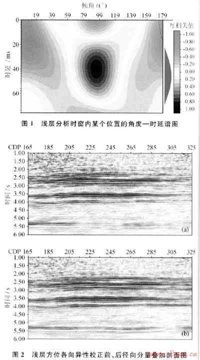 圖1為淺層分析時(shí)窗內(nèi)某個(gè)CDP位置的角度一時(shí)延圖,從圖1中可以看出,該位置的各向異性方向約90°(即東西方向),快慢橫波時(shí)差超過40ms,表明淺層各向異性特征明顯。圖2是淺層方位各向異性校正前后的徑向分量疊加剖面對(duì)比,從圖2中可以看出,經(jīng)過方位各向異性校正后的剖面的連續(xù)性得到了較大的提高,有效反射得到了加強(qiáng),成像質(zhì)量得到了明顯的改善。與此同時(shí),淺層分析時(shí)窗以下的徑向分量數(shù)據(jù)的能量也發(fā)生了變化,說明各向異性具有“傳遞”作用,上層的各向異性會(huì)影響下層。