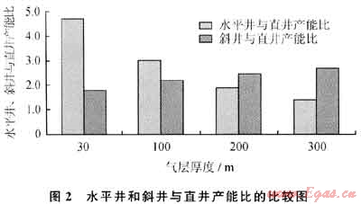 。水平井開發(fā)油氣藏要求兩個基本的適用條件:①油氣層不能太厚;②垂向滲透率不能太低。 綜合分析氣井的物性參數(shù),建立不同井型的投入產(chǎn)出計算模型,明確不同井型的開采效果。圖2是采用普光氣田實際儲層參數(shù)計算的不同厚度氣層條件下斜井和水平井同直井的產(chǎn)能比,這里斜井井斜角取75°,水平井水平段長度取600m,氣層垂向滲透率與水平滲透率之比取0.5。從圖2中可看出,對有效厚度小于100m的氣層,水平井相對直井的增產(chǎn)效果明顯好于大斜度井,其增產(chǎn)倍數(shù)是斜井的2倍。但對于有效厚度大于200m的氣層,大斜度井的開發(fā)效果好于水平井。