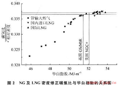 對華白指數限定范圍的控制是天然氣利用的安全性、環(huán)境排放和效率的保證。燃氣的碳氫比數決定了不完全燃燒指數的大小或燃燒的C0排放量。圖2給出了相對密度修正的碳氫比和華白指數的關系。由此可見控制華白指數范圍與控制碳氫比的變化一樣,具有限定不完全燃燒指數或黃焰指數的同樣功效。圖2中GS(M)R是英國燃氣安全管理規(guī)范“Gas Safety(Management)Regulations”的縮寫。
