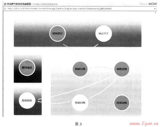 由于每條投訴信息均規(guī)定了統(tǒng)一的處理流程,因此,我們可以通過(guò)系統(tǒng)查詢(xún)某條信息正處于投訴處理的哪個(gè)階段,并以不同顏色予以區(qū)分,其中,綠色表示已經(jīng)通過(guò)的階段,白色表示尚未完成的階段,并且,某條投訴若上級(jí)或領(lǐng)導(dǎo)作過(guò)批注,則以紅色表示,具體如圖3所示: