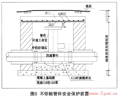 (1) 為確保管網(wǎng)安全運(yùn)行,對(duì)無(wú)法滿足規(guī)范要求埋深的管道、管件按圖5所示增加安全保護(hù)裝置。該保護(hù)裝置適用于機(jī)動(dòng)車(chē)道、非機(jī)動(dòng)車(chē)道及其他路段的不停輸作業(yè)施工。施工時(shí)基地要密實(shí)且避免雨天施工,混凝土基礎(chǔ)板與管底間必須用素混凝土澆搗密實(shí);蓋板為預(yù)制可移動(dòng)且上方預(yù)留探孔,方便今后日常維護(hù)。在開(kāi)挖條件許可的情況下,可采用四通管件底部開(kāi)孔預(yù)制連接施工法滿足規(guī)范埋深要求。