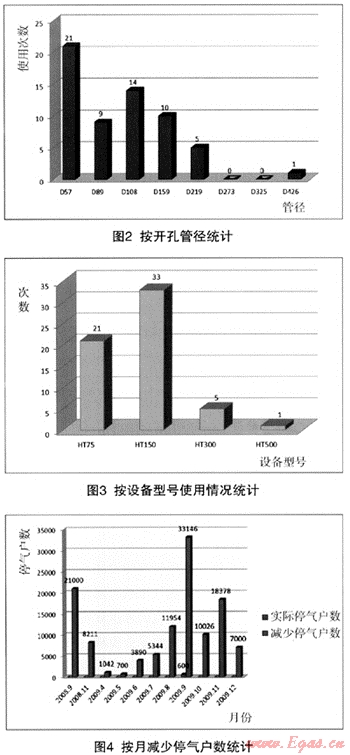 從統(tǒng)計(jì)圖中可以發(fā)現(xiàn),主要使用的設(shè)備為HT75、HT150系列,約占總數(shù)的90%,主要使用在帶氣開(kāi)旁通,約占71%,管徑集中在D57—D159,約占90%,在施工過(guò)程減少停氣用戶約120000戶,減少了約6400m3燃?xì)獾娜紵欧?,?jié)約1900m3的氮?dú)庵脫Q,避免了約4360h/人·次夜間施工作業(yè)。