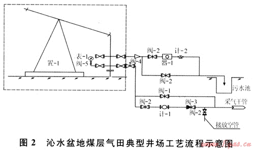 采用套管采氣、油管采水的井場工藝。井口由抽油機將地層水采出,通過消氣器將水中攜帶的氣體分離,經(jīng)水表計量后排至井場污水池中。煤層氣從煤層中解吸后由套管采出,通過井場智能旋進流量計計量后,經(jīng)采氣管線輸送至集氣站。井場設(shè)置放空火炬及排采放空接口,在排采及事故時將煤層氣放空焚燒。井場工藝流程圖見圖2所示。