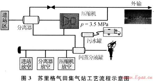 集氣站內(nèi)主要設(shè)備有氣液分離器、壓縮機組、污水罐和清管器收發(fā)球筒等設(shè)備。其工藝流程見圖4。