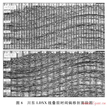 圖2為四川盆地東部某地區(qū)LDXX線水平疊加剖面,剖面上方為地表高程曲線??梢钥闯觯涸摐y線地表起伏劇烈,海拔高程在280~1180m之間,部分地段地形切割厲害,橫向100m范圍內(nèi)高程差達(dá)800m。從水平疊加剖面能看到,資料信噪比較高,但地覆構(gòu)造比較復(fù)雜,各種地震波發(fā)育。根據(jù)以往的地震地質(zhì)經(jīng)驗(yàn)及鉆井分析,該地區(qū)速度橫向變化不大,完全滿足疊前時(shí)間偏移條件,使用疊前時(shí)間偏移技術(shù),能較好地使繞射歸位,提高資料橫向分辨率,較準(zhǔn)確地落實(shí)地腹構(gòu)造形態(tài)。