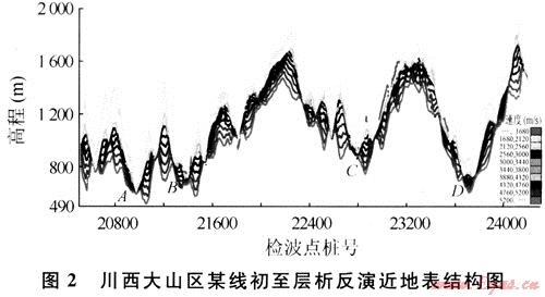圖2中低速帶速度介于1500~2550m/s之間,降速帶速度超過3900m/s,厚度橫向變化大,稱之為典型的近代塔式風化模式。多少萬年前形成嚴重的切割地形,受大自然風化作用,不同部位風化程度不同,最尖銳的山尖部位,明顯剝蝕得快些,速度低且厚度大。隨著深度的增加,等速度面速度越來越高,而橫向上高程的變化越來越平緩。