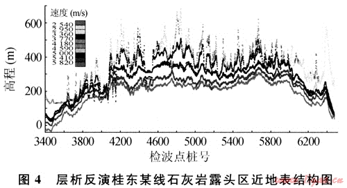 圖4為層析反演桂東石灰?guī)r露頭區(qū)某測線的近地表結構。不少人認為如此石灰?guī)r露頭區(qū)不會有低速帶,可層析反演的結果明顯看出,盡管野外看起來還是石灰?guī)r,但它的表層速度卻只有2000m/s,而且隨著深度的增加逐漸變高,直至沒有風化到的高速層面附近原始石灰?guī)r處。其低速帶速度在2000~5000m/s之間,厚度橫向高頻變化。降速帶速度在5000m/s以上,厚度不是很大??梢?,其靜校正量的長周期變化很小,也不會超過一個排列長度,主要還是高頻成分。