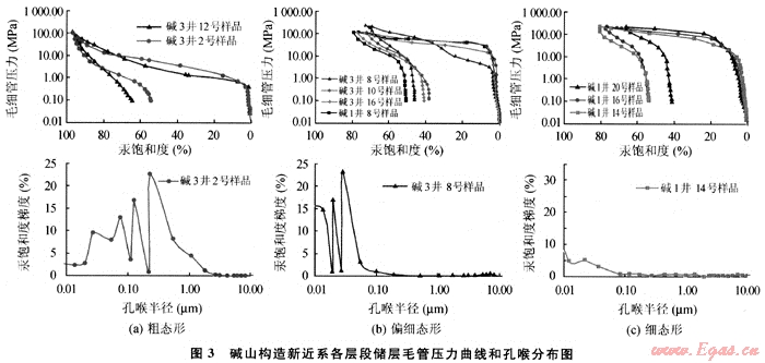 儲(chǔ)層孔隙結(jié)構(gòu)分為粗態(tài)型、偏細(xì)態(tài)型和細(xì)態(tài)型3種類型,整體排驅(qū)壓力較高(圖3),儲(chǔ)層主要流動(dòng)喉道半徑較小,喉道孔徑主要分布在小于0.1μm的范圍,屬小孔-微細(xì)喉型,喉道系統(tǒng)較復(fù)雜,均勻程度差,分選不好,孔喉比大,喉道相當(dāng)彎曲,因而排驅(qū)壓力和飽和度中值壓力高,退出效率低,充分表明儲(chǔ)層孔隙結(jié)構(gòu)差,故儲(chǔ)層滲透能力差,為差儲(chǔ)集層,不利于油氣的運(yùn)聚。從縱向上整體來看滲流能力由上向下逐漸變差(表2)。根據(jù)裘亦楠、王允誠(chéng)等確定的砂巖儲(chǔ)層分類評(píng)價(jià)方案所示,表明堿山構(gòu)造各儲(chǔ)層屬Ⅱ3-Ⅳ類儲(chǔ)層,即中下等到很差-差類儲(chǔ)層,這也是該區(qū)沒有形成規(guī)模聚集的主要原因之一[8~9]。