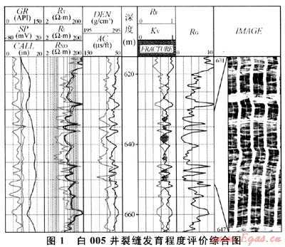 將上述評價裂縫發(fā)育程度指標(biāo)的計算模型和參考文獻(xiàn)[1]所述巖石力學(xué)動靜態(tài)轉(zhuǎn)換關(guān)系式編制成Fortran語言,掛接在Forward測井解釋平臺上,實現(xiàn)單井逐點可視化處理。對工區(qū)內(nèi)10多口具有成像測井資料和巖心描述的井進(jìn)行了裂縫發(fā)育程度指標(biāo)處理,圖1為白005井裂縫發(fā)育程度評價綜合成果圖。由圖1不難發(fā)現(xiàn),630~652m井段,完整性系數(shù)值較低、裂縫發(fā)育程度指標(biāo)值較高、巖石穩(wěn)定系數(shù)值偏低,從所對應(yīng)的成像測井圖上可以看出,該段斜交縫和網(wǎng)狀縫較為發(fā)育,巖心描述為半充填的低角度和網(wǎng)狀縫。從工區(qū)內(nèi)其他井的處理情況來看,處理結(jié)果與成像測井和巖心描述對應(yīng)性都較好。因此,筆者所述方法對研究工區(qū)火山巖裂縫發(fā)育程度評價較為有效。