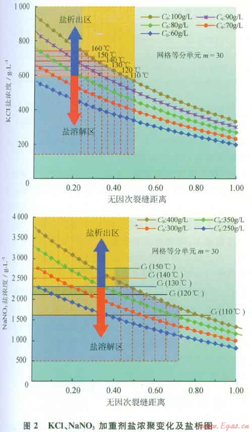 采用以上模擬原則,以KCl、NaN03加重液為例,分析加重液在高溫高壓氣藏增產(chǎn)過(guò)程中鹽析過(guò)程。圖2是KCl、NaN03模擬鹽濃聚變化和鹽析結(jié)果圖。從圖可看出,即使地面使用加重液鹽度遠(yuǎn)低于該溶液的臨界飽和溶解度,但在高溫地層返排過(guò)程中加重液經(jīng)過(guò)逐漸濃聚后極易產(chǎn)生鹽析。如采用70g/L的KCl鹽水和250g/L的NaN03鹽水,20℃時(shí)其臨界飽和溶解度分別為254.8g/L和467g/L,但在高溫地層返排過(guò)程中經(jīng)過(guò)逐漸濃聚后,在距裂縫壁附近液體鹽度可高達(dá)620g/L和2000g/L以上,超過(guò)溫度110℃時(shí)兩者的臨界飽和鹽度(其臨界飽和鹽度分別為600g/L和1940g/L),部分鹽將從溶液中結(jié)晶析出,即產(chǎn)生鹽析現(xiàn)象。該濃度低于130℃時(shí)兩者的臨界飽和溶解度,因此當(dāng)返排溫度為130℃時(shí),溶液無(wú)鹽析現(xiàn)象屬于穩(wěn)定狀態(tài)。