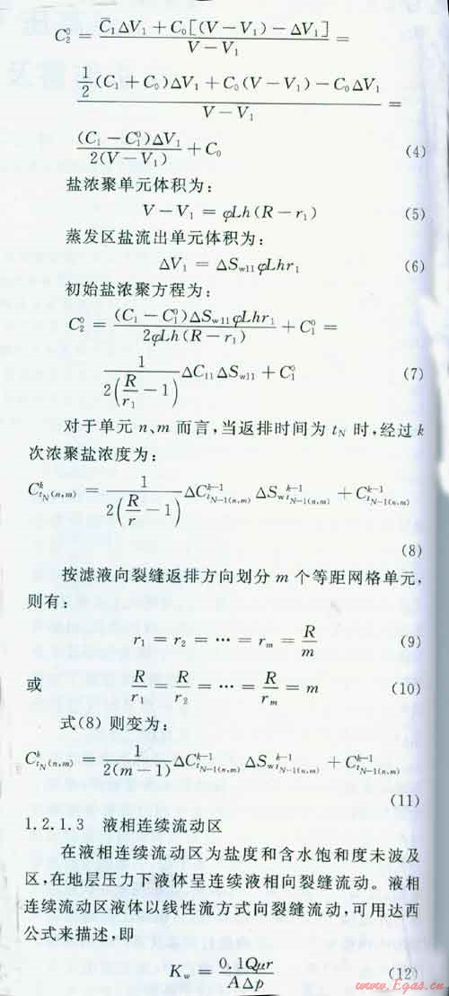 在返排初期,存在著濾液前緣初始蒸發(fā)區(qū)、過(guò)渡區(qū)和液相連續(xù)流動(dòng)區(qū)。在濾液進(jìn)入地層最前緣區(qū)主要存在氣一液混合相,即濾液與地層天然氣流體組成的水一烴多組分混合體系,其余濾失區(qū)充滿高鹽度的加重液濾液。受地層加溫作用,前緣區(qū)濾液溫度非常接近地層溫度,其溫度介于120~140℃。當(dāng)開(kāi)井返排時(shí)因壓力劇集下降,此時(shí)前緣區(qū)氣一液混合相將發(fā)生變化,部分濾液中液相蒸發(fā)成水蒸氣[2-3],并以氣一液體混合相向裂縫流動(dòng),使前緣區(qū)液相逐步減少,殘留液體的鹽度增加,并向相鄰單元擴(kuò)散和傳輸[4-7],從而增加與此接觸過(guò)渡區(qū)液體的鹽度,其余區(qū)域?yàn)V液仍為連續(xù)液相向裂縫流動(dòng)。