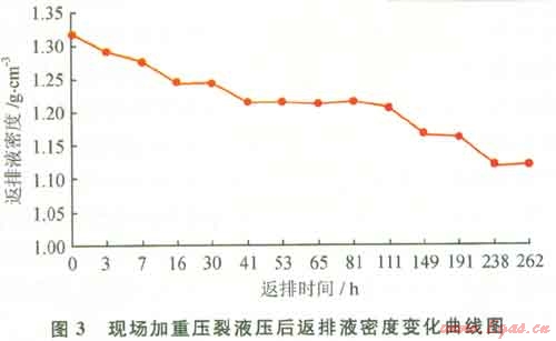 以某高溫高壓氣井使用加重壓裂液施工為例,該井氣層井深5300m,地層溫度145℃。采用40%加重劑加重瓜膠壓裂液,其密度達(dá)1.32g/cm3。在最大泵壓88 MPa下注入地層總液量632.5m3和陶粒42.8m3。該氣井壓裂后獲得高產(chǎn)氣流,增產(chǎn)效果顯著。但現(xiàn)場(chǎng)監(jiān)測(cè)壓裂后返排出地面液體性能表明,壓后液體破膠較徹底,返排液體黏度在3mPa·s。左右,但返排液體密度比壓裂前液體密度低0.1~0.2g/cm3,且隨返排時(shí)間增加返排出的液體密度逐漸下降(圖3)。表明該井在儲(chǔ)層增產(chǎn)作業(yè)過(guò)程中已產(chǎn)生了部分鹽析造成鹽分丟失,使得壓后返排液體密度下降。在該地區(qū)采用相同加重壓裂工藝改造的氣井普遍存在類似現(xiàn)象。
